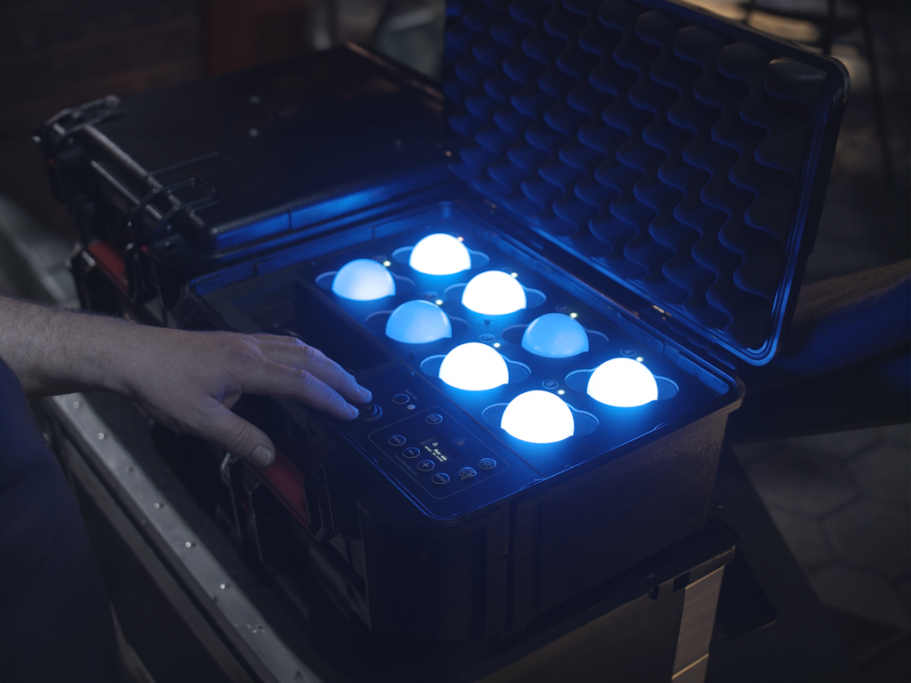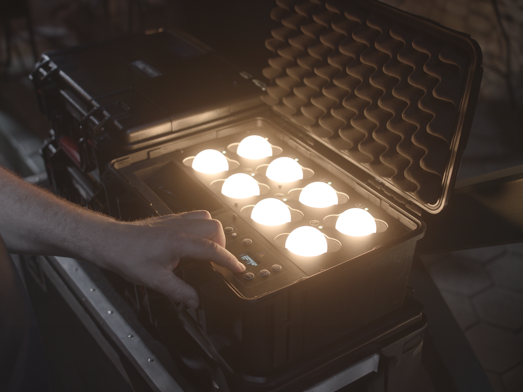 Der PrepCase hat einen eingebauten Akku, der die Vorbereitung erleichtert, egal wann und wo Sie Ihre LunaBulbs für einen Auftrag einsetzen und konfigurieren müssen.