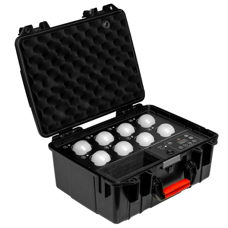 Kit mit 8 LunaBulbs in einem robusten, schützenden Kunststoffkoffer mit Tragegriff.