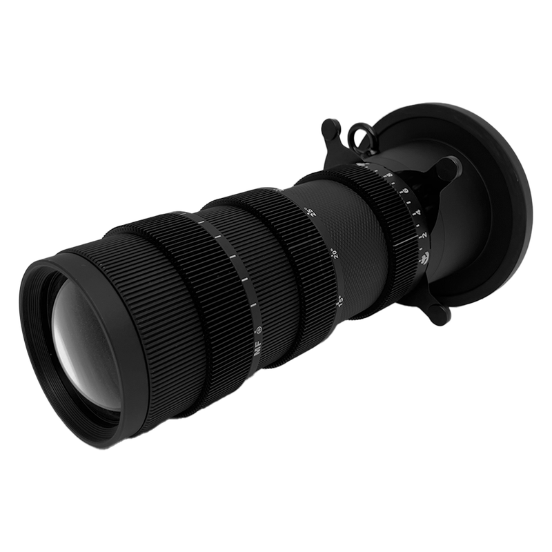 In der ProjectionLens ist ein manueller Zoom für eine Projektion von 16° – 36° integriert, der durch Drehen des Zoomrads bedient werden kann. - Zwei Focus-Räder